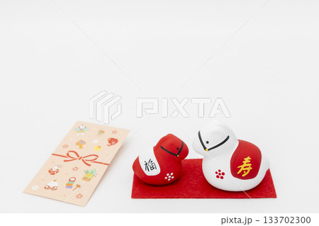 白い背景に置かれた紅白の午の置物と和柄のお年玉袋 お正月のイメージ
