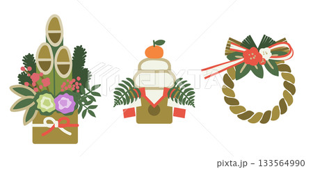 お正月飾り 門松・鏡餅・しめ飾り ナチュラルカラーのイラストセット