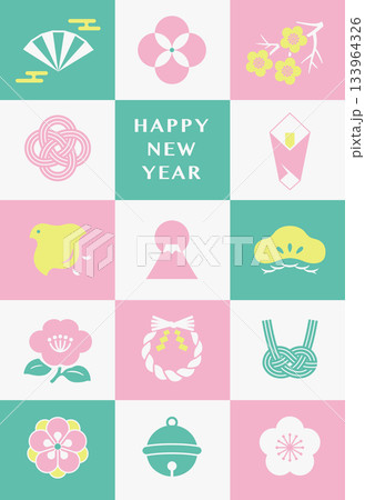 横向き_新春パステルカラーの市松模様のポストカード