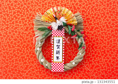 しめ縄飾り お正月 縁起物【赤背景 シンプル コピースペース】
