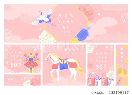 2026年のお正月新年の馬モチーフデザインバナー:午年キャンペーンセール広告セット