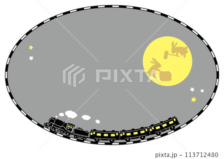 パターンブラシで描いた線路のフレームとおもちゃ風のSL C62のシルエットデザインに月と兎 楕円