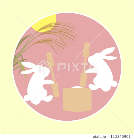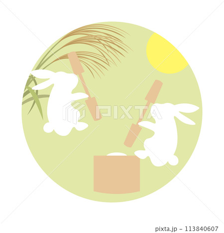 餅つきをしているウサギのイラストデザイン 月とススキ