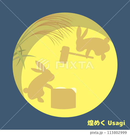 餅つきをするウサギのシルエットと月のデザイン 煌めくUsagi