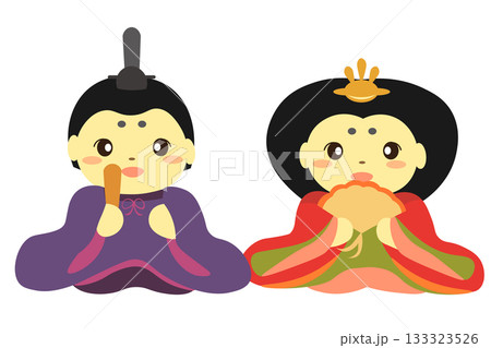 紫色の着物の男雛と色鮮やかな着物の女雛のイラスト