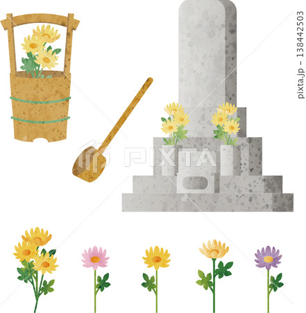 水彩画のお墓参りとお供えの花のイラストセット 飾り あしらい 背景 デザイン素材