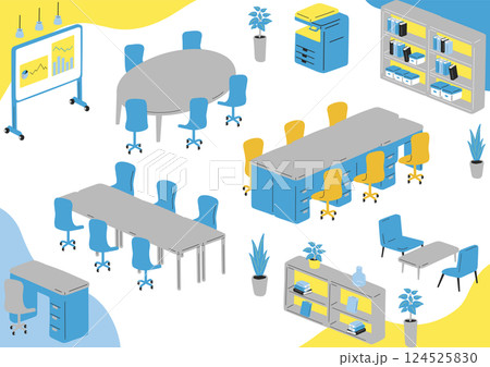 デスクの並んだオフィスのシンプルでかわいいアイソメトリック線画イラスト