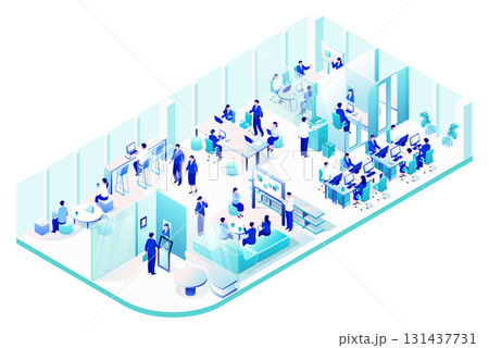 アイソメトリックで描いた現代的なオフィスフロアのイラスト
