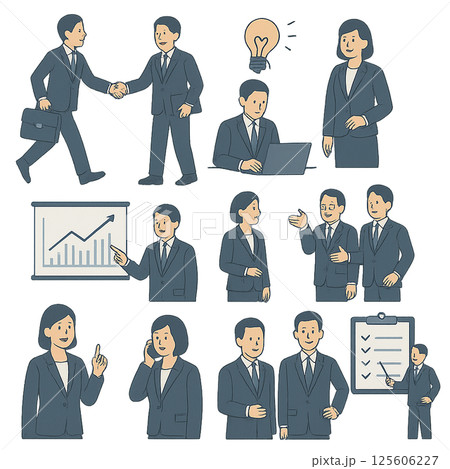 ビジネスシーンでの移動・会話・作業のイラストセット
