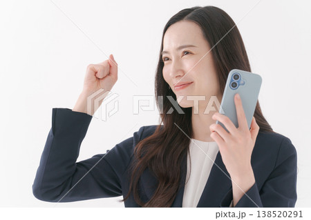 スマートフォンを手にガッツポーズで喜ぶ笑顔の日本人ビジネス女性と背景のチーム
