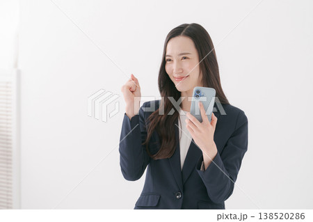 スマートフォンを持ってOKポーズをする若い女性・ビジネスウーマン