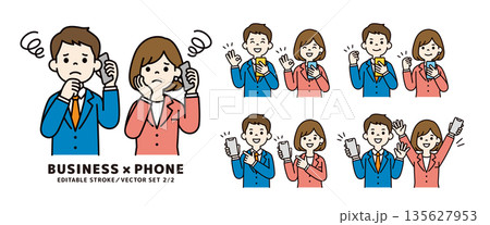 スマホを持つ男性社員・女性社員の、いろいろな表情・ポーズの上半身ベクターイラスト素材セット