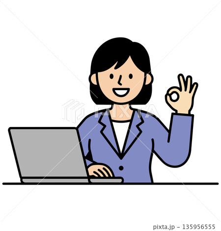 PCの前で笑顔でOKサインを出す紺色のスーツの女性