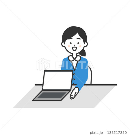 ノートパソコンの画面をこちらに向けるスーツ姿の女性イラスト