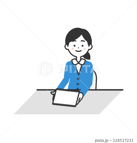 タブレット端末の画面をこちらに見せるスーツ姿の女性イラスト