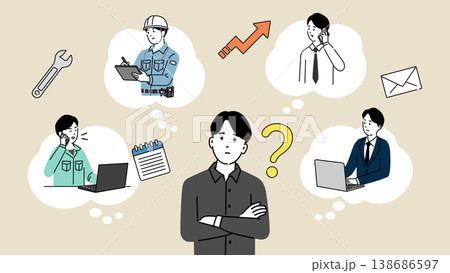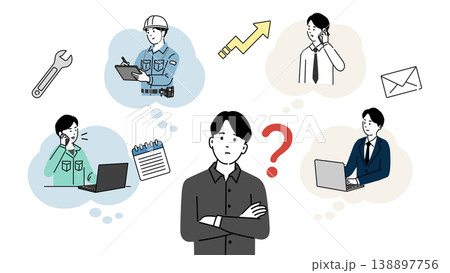 デスクワークと現場仕事、どちらがいいか悩む学生のイラスト、将来の仕事を考える人物