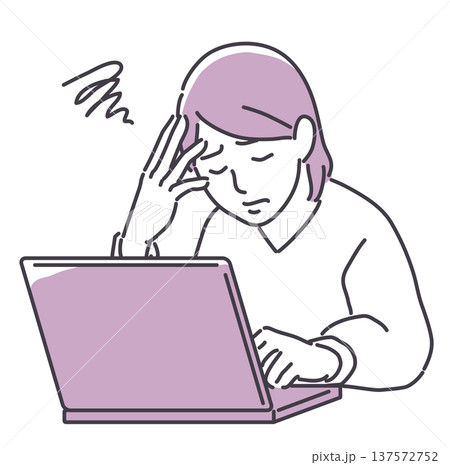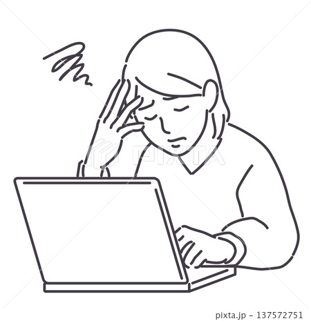 ノートパソコンと悩む女性 線のみ