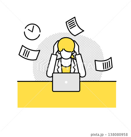 パソコン操作がうまくいかない女性と時計のシンプル線画イラスト