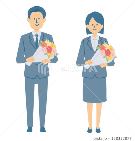 花束を持ったスーツ姿の人物の全身イラスト