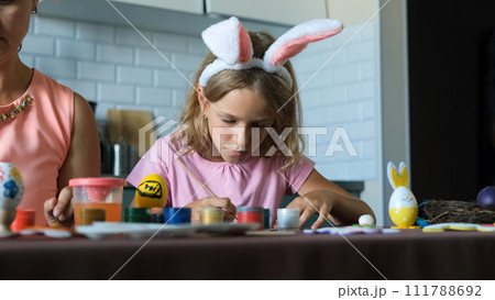 写真素材: Little girl in bunny ears with her mother making Easter decorations at home