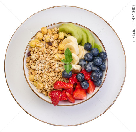 写真素材: Granola with strawberries, kiwi, banana and blueberries in a white round plate