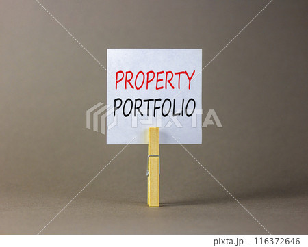 写真素材: Property portfolio symbol. Concept words Property portfolio on beautiful white paper on wooden clothespin. Beautiful grey background. Business Property portfolio concept. Copy space.