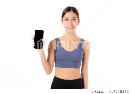 写真素材: Young asian woman in sportswear workout holding and presenting blank screen smartphone isolated.