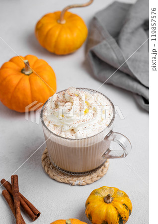 Spice latte with whipped cream in glass cup on...[119857576]の写真素材は、かぼちゃ、カボチャ、南瓜のタグが含まれています。この素材はOlga Buntovskikhさん(No.2532457)の作品です。SサイズからXLサイズまで、¥550からご購入いただけます。無料の会員登録で、カンプ画像のダウンロードや画質の確認、検討中リストをご利用いただけます。 全て表示