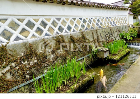 津和野 殿町通り なまこ塀を取り巻く堀割りに錦鯉が泳ぐ風景 島根県鹿足郡津和野町