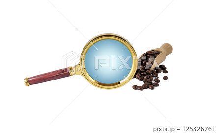写真素材: Coffee beans in wooden scoop with magnifier on white background.