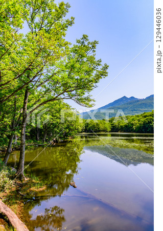 写真素材: 北海道知床半島にある知床五湖を、6月の澄んだ青空の下で散策する風景。湖面に映る山々と原生林が美しい。