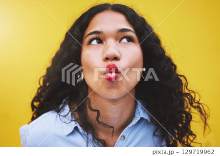 写真素材: Black woman lips in kiss, red cosmetic lipstick and face closeup on yellow background. Retro aesthetic, young fashion model with funky pose thinking with cool beauty makeup on bright studio wall