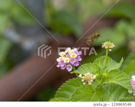 写真素材: 飛ぶイチモンジセセリとランタナの花