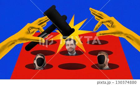 写真素材: Creative collage. Man targeted by giant hammer in whack-a-mole metaphor of corporate control