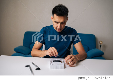 写真素材: Portrait of technician male assembling wi-fi module using specialized tools at home office desk, focusing on intricate components and ensuring proper connection. Concept of desktop PC maintenance