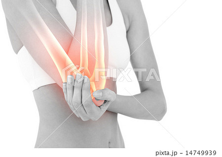 写真素材: Highlighted elbow pain of woman