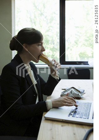 写真素材: 仕事をしながら食事をとるビジネスウーマン