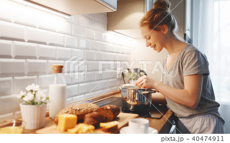 young woman in pajamas prepares breakfast in...[40474911]の写真素材は、キッチン、台所、女性のタグが含まれています。この素材はevgenyatamanenkoさん(No.186638)の作品です。SサイズからXLサイズまで、¥550からご購入いただけます。無料の会員登録で、カンプ画像のダウンロードや画質の確認、検討中リストをご利用いただけます。 全て表示