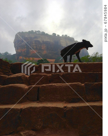 写真素材: 曇天のシーギリヤロックとあくび中の犬
