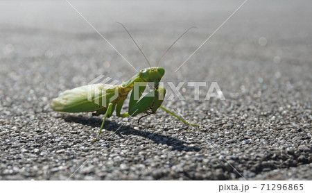 写真素材: アスファルトの上を歩く大カマキリ(昆虫)