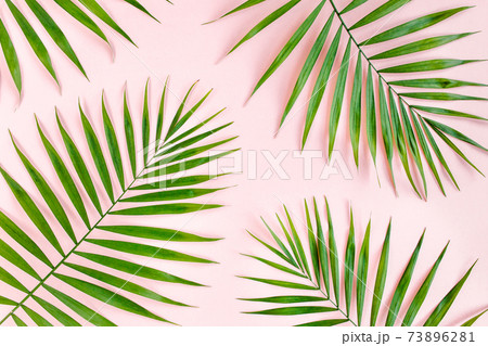 写真素材: Texture tropical green palm leaves on pink background. Flat lay, top view