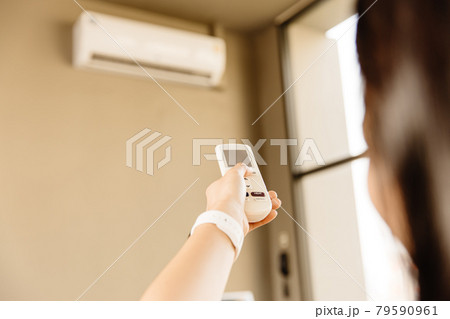 写真素材: Closeup people using remote control adjust room temperature in home office pointing to Air conditioner in hot summer season.