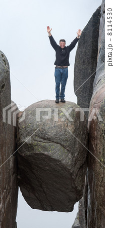 写真素材: Man standing on the famous rock Kjeragbolten (Lysefjorden, Norwa