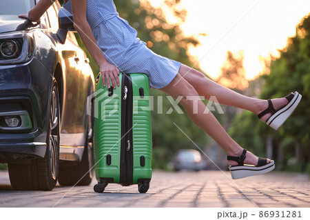 写真素材: Closeup of young woman slim legs resting on suitcase bag beside car. Travelling and vacations concept.