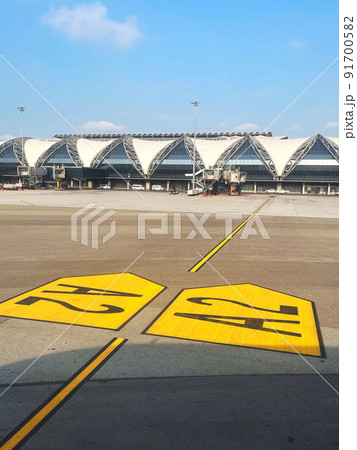 写真素材: International Airport view, Airplane taxiway, Path for lead aircraft transfer to and from passenger gate, prepare to take off and begin journey.