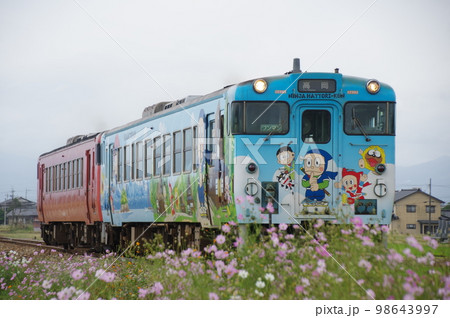 写真素材: 城端線 東野尻付近 コスモスとハットリくん気動車