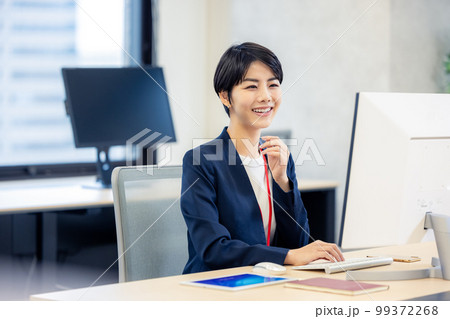 パソコンの前のかわいいカメラ目線の女性 春夏