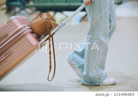 キャリーバッグにまたがって空港ロビーを移動する訪日客
