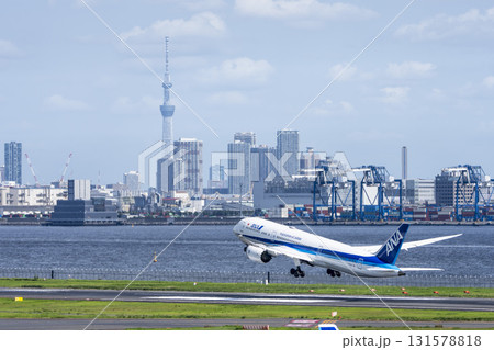 羽田空港の風景 離陸中の飛行機と東京スカイツリー 東京都大田区