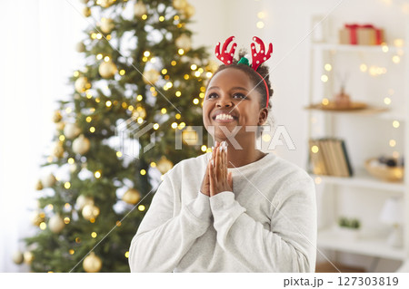 Merry Christmas and Happy New Year holiday african american woman smiling, palms folded